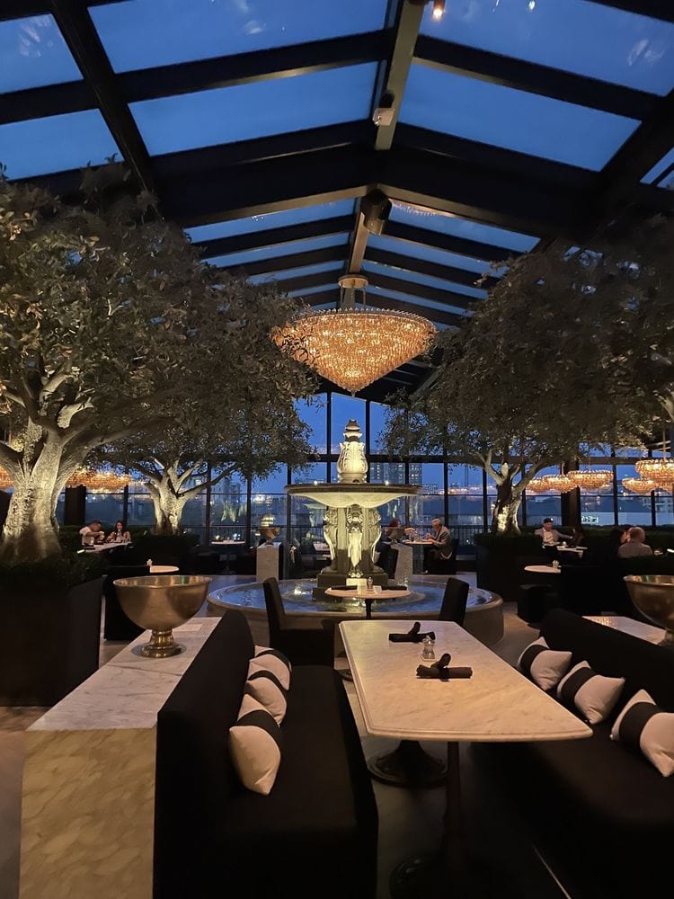 RH Rooftop Restaurant is where romance rises as high as the skyline. Slip upstairs with your date and you’ll land in a glass‑roofed garden escape with glimmering chandeliers, trickling fountains, heritage olive trees and cozy seating that feel more secret garden than a city restaurant. Toast the night with a curated wine or craft beer, then share something indulgent like the truffle fries or a hearty ribeye.